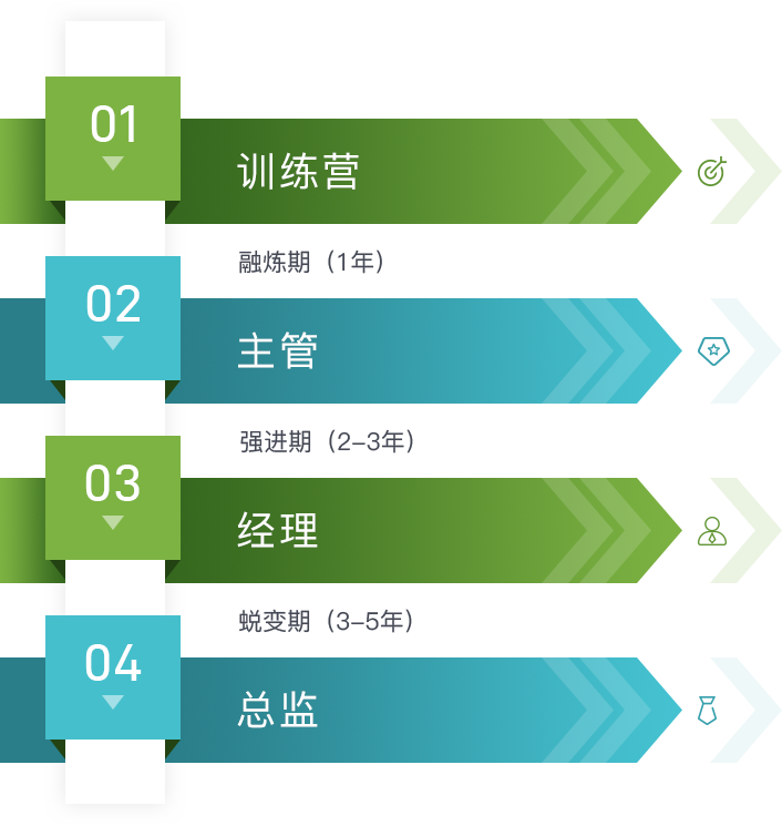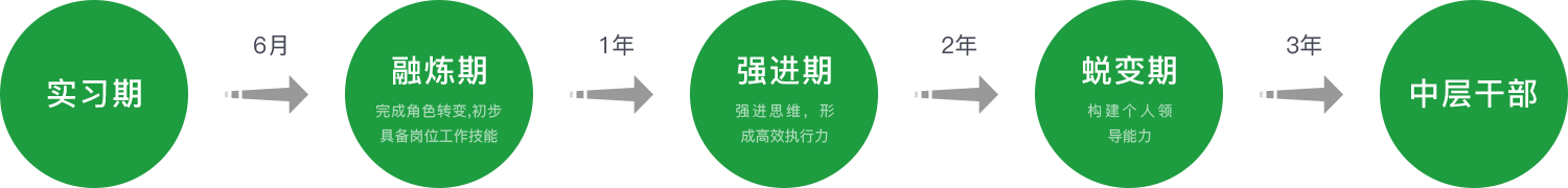 和聚力培養(yǎng)周期為三年,不同階段輔以不同培養(yǎng)項目,職位目標(biāo)為晉升至中層。6次評估、4次晉升、15場集中培訓(xùn)、3次拓展活動、9次座談會/案例分享